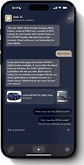 Motive Intelligence gives you AI-powered chat, descriptions, search, and background replacement overnight. Preloaded with INFINITI data and infinitely expandable with your own custom knowledge base, Ask AI unlocks accurate answers to the hardest questions. And when your customer is ready to start browsing, they can ask for vehicle recommendations directly from Ask AI.